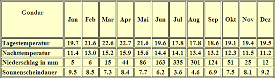 Temperaturen ÄthiopienDie warm-gemäßigte Zone „Woina Dega“ liegt zwischen 1500 und 2400 m in Zentraläthiopien. Hier herrschen angenehme Durchschnittstemperaturen von 22 °C und etwa 1000 mm Regen. Im kalten „Dega“ darüber liegen die Jahresdurchschnittstemperaturen deutlich unter 16°C, während das Thermometer nachts nur 5-10 °C erreicht. Es gibt auch viel mehr Niederschlag mit 1200-1800 mm.